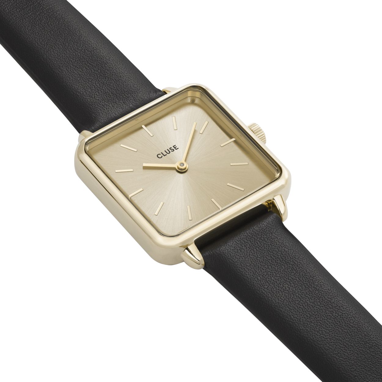 Dit is een horloge van Cluse. De kast is gemaakt van messingen de kleur van de kast is goud. De band is gemaakt van leer en de kleur van deze band is zwart .