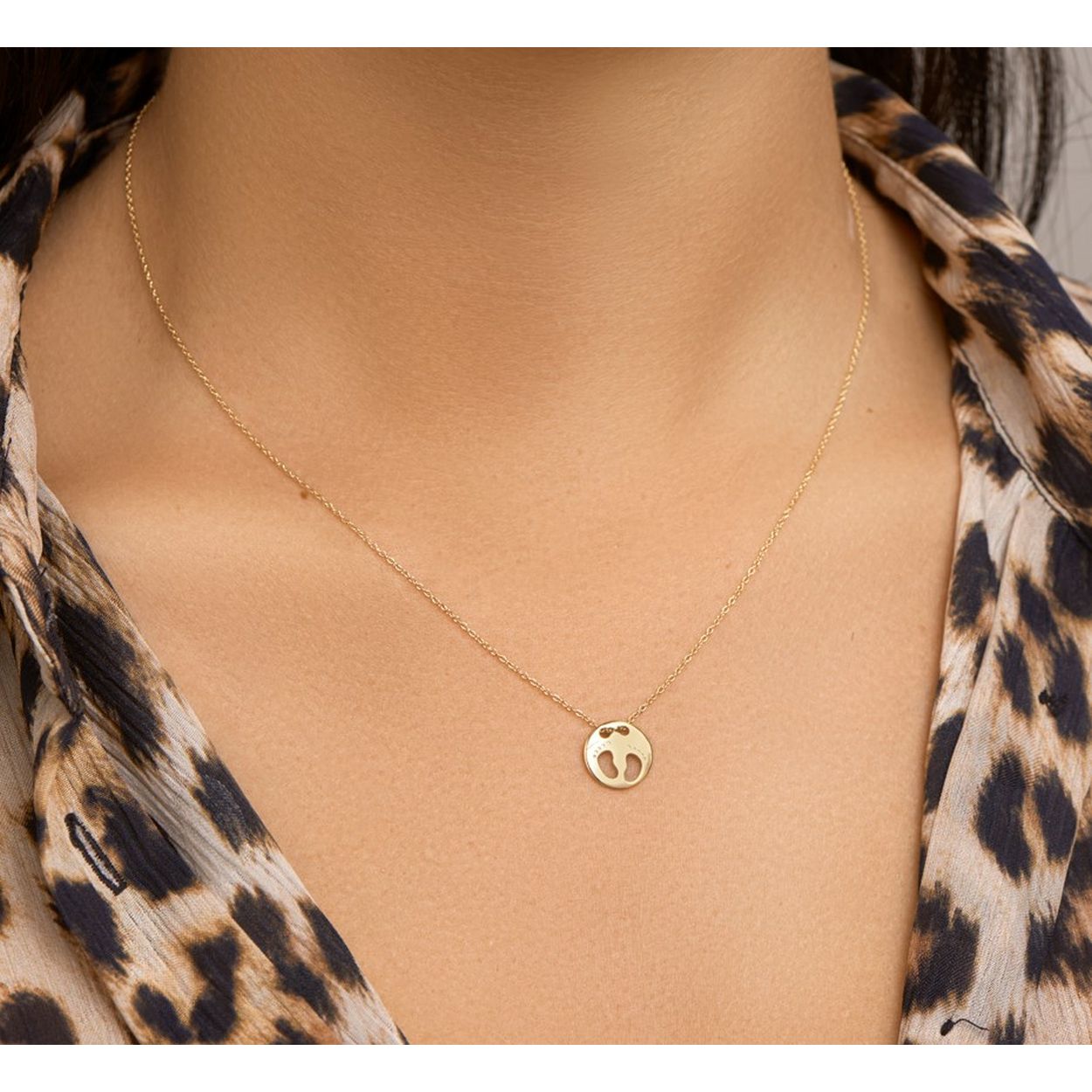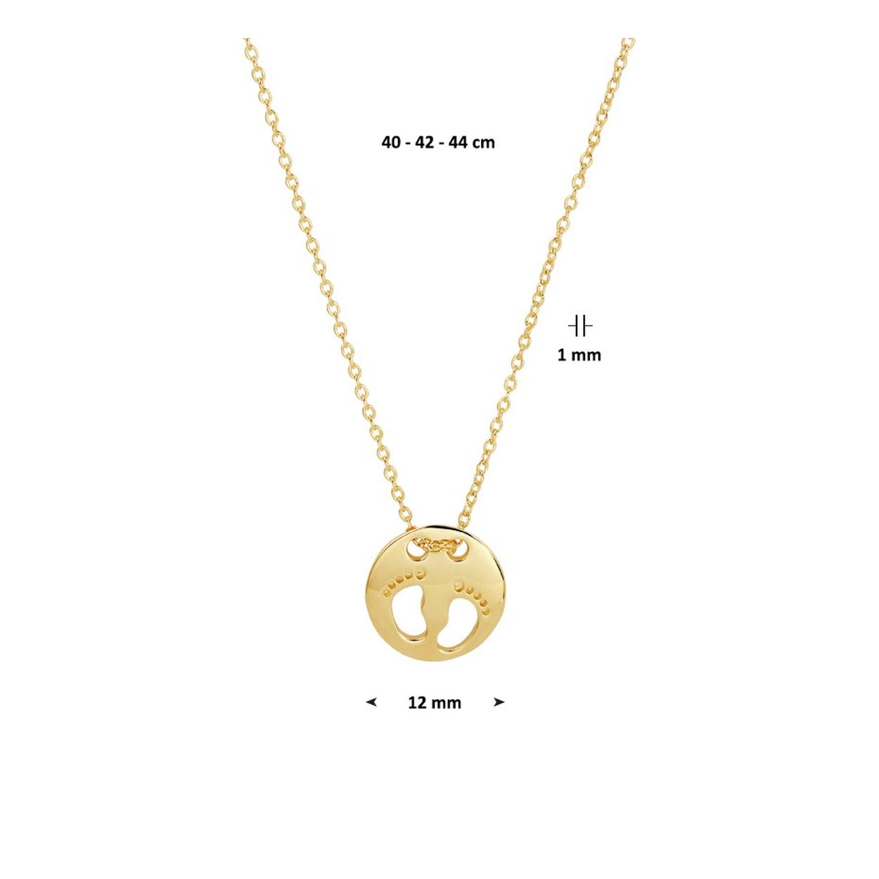 14k Geelgouden anker collier uitgevoerd met een poli afgewerkt rond hangertje met een voeten voorstelling. Het collier heeft een stevige karabijn sluiting en draaglengtes van 40, 42 en 44cm. De hanger heeft een diameter van 12mm.