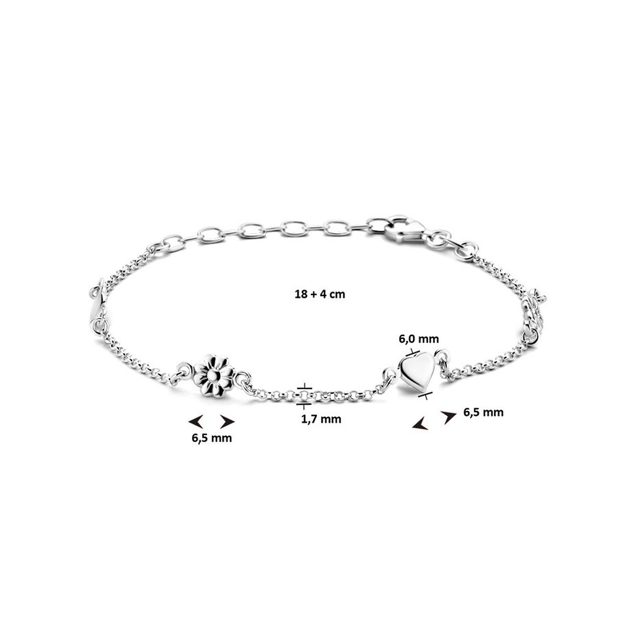 Gerhodineerd 925 zilveren enkelbandje uitgevoerd met een hartje en een bloemetje. Het enkelbandje heeft een draaglengte van 18cm met een extensie van 4cm en een stevige karabijn sluiting.