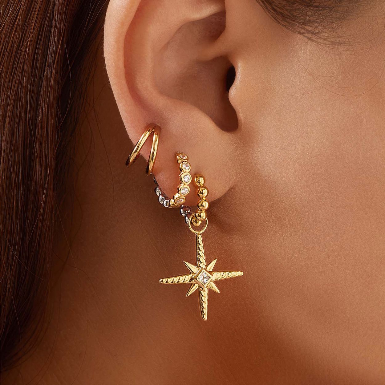 Omarm hedendaagse elegantie met onze dubbele lusoorringen in 14kt verguld sterlingzilver. Draag het paar alleen of gestapeld met andere studs, hoops en ear cuffs, je zult zeker een stijlstatement maken.