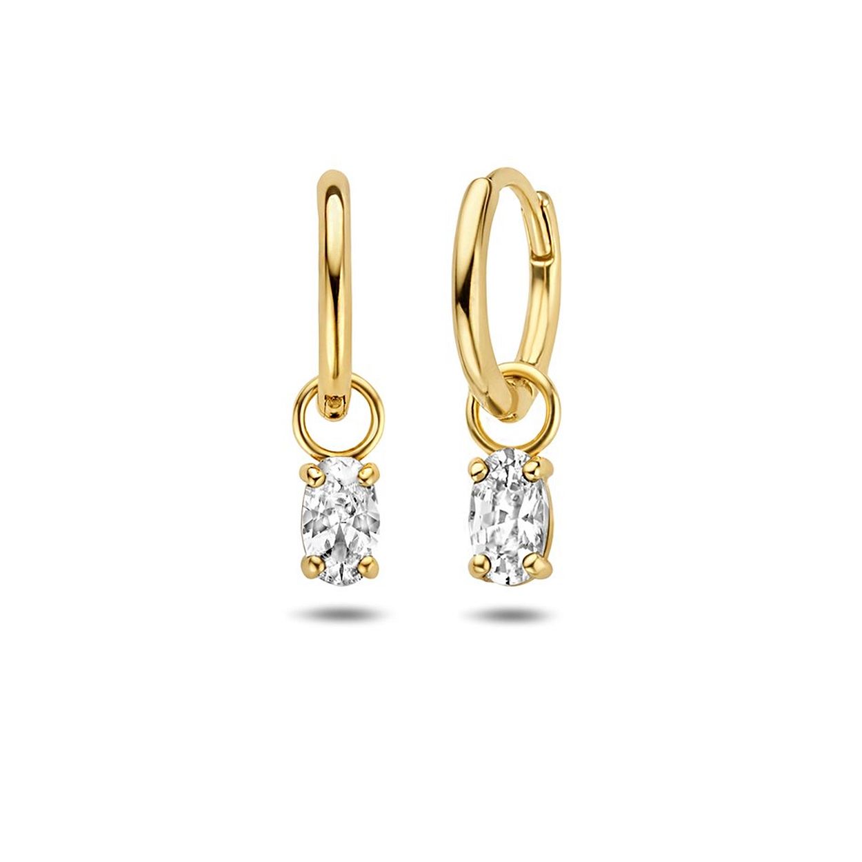 14k Geelgouden klapoorringen uitgevoerd met een hanger met daarin een heldere zirkonia. De klapoorringen hebben een diameter van 10mm en een dikte van 1.4mm. De hanger heeft een afmeting van 8x3mm.