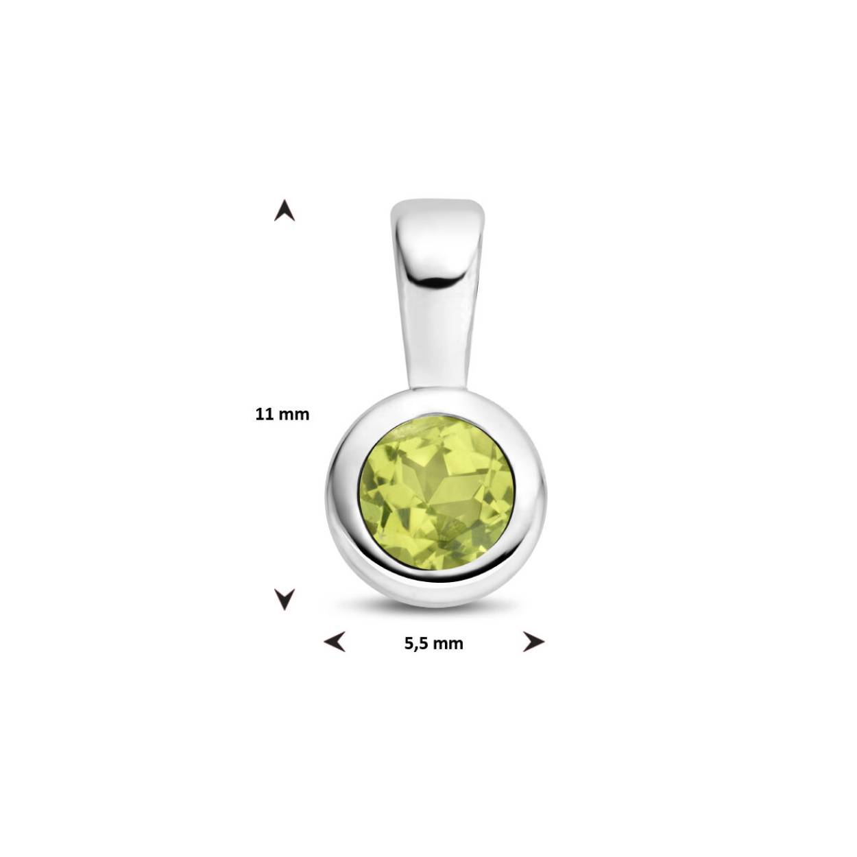 Gerhodineerd 925 geboortesteen zilveren hanger uitgevoerd met een schitterende peridot. De hanger heeft een afmeting van 11x5.5mm. De peridot heeft een steengewicht van 0.30ct.