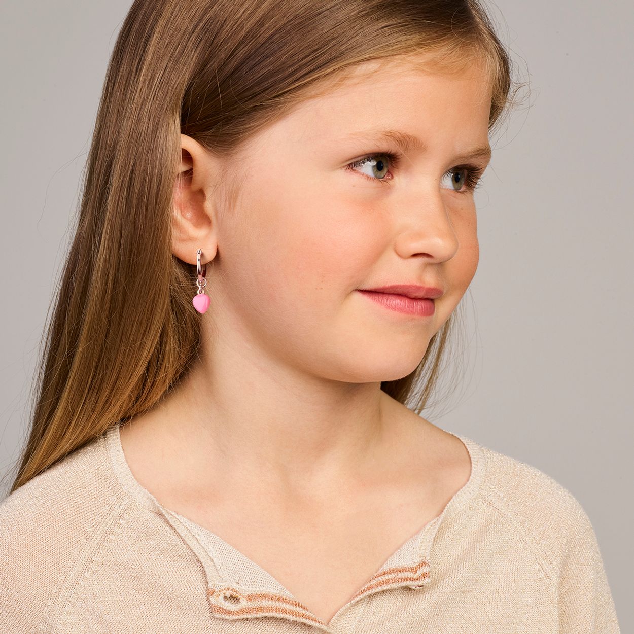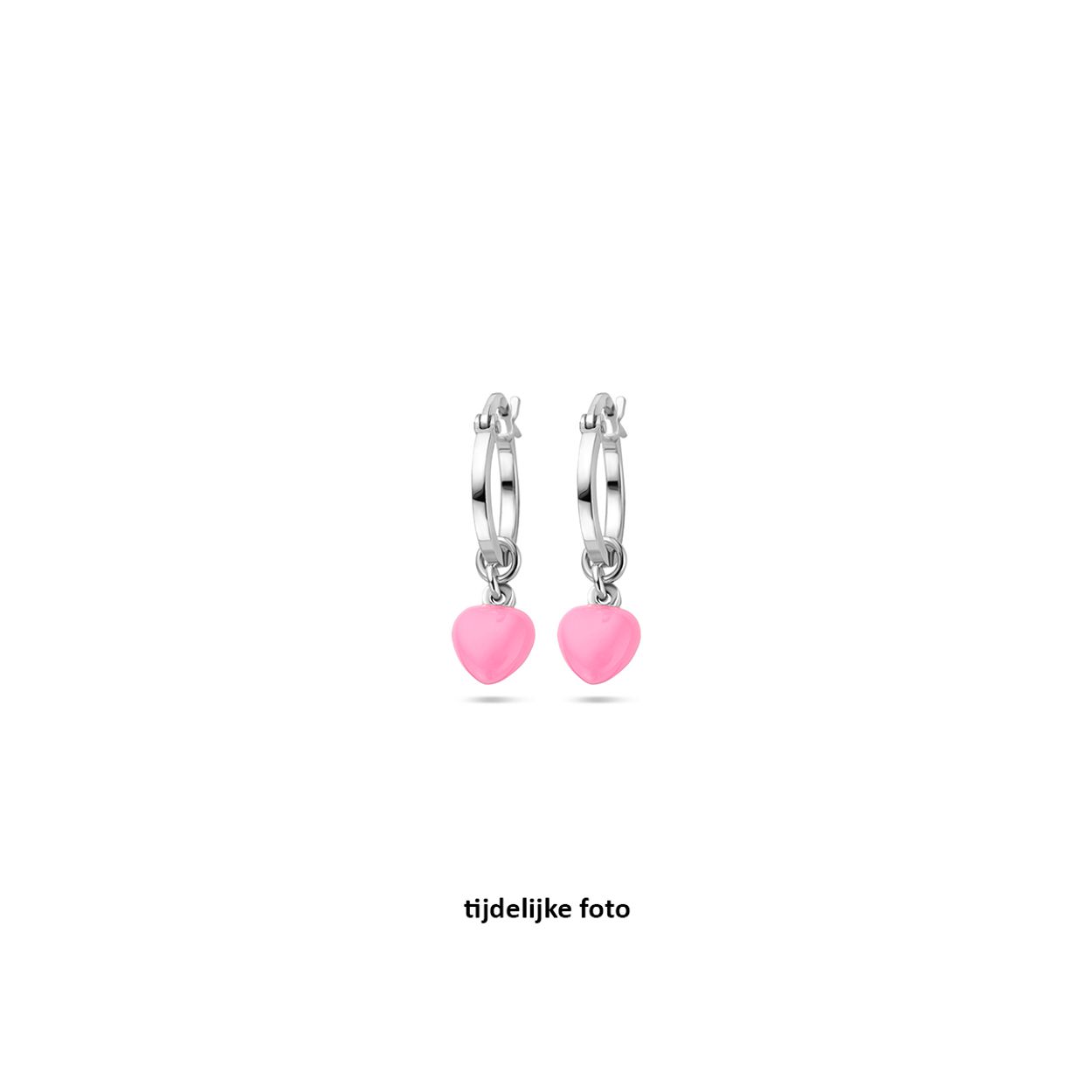 Gerhodineerd 925 zilveren oorringen uitgevoerd met een roze emaille hart. De oorringen hebben een totale hoogte van 26mm.
