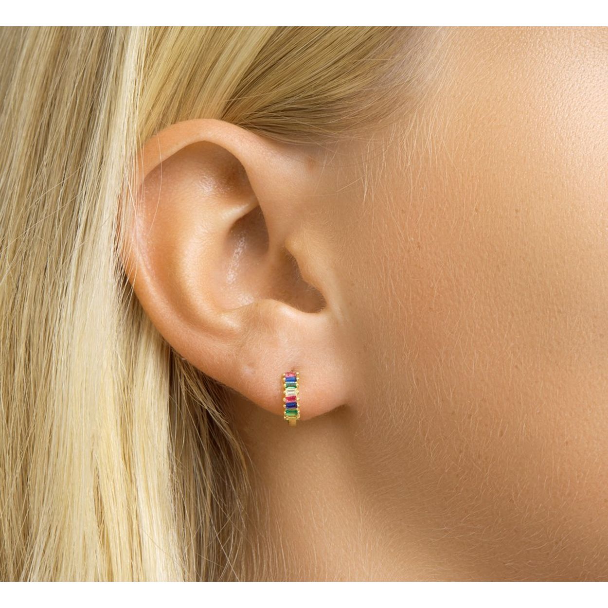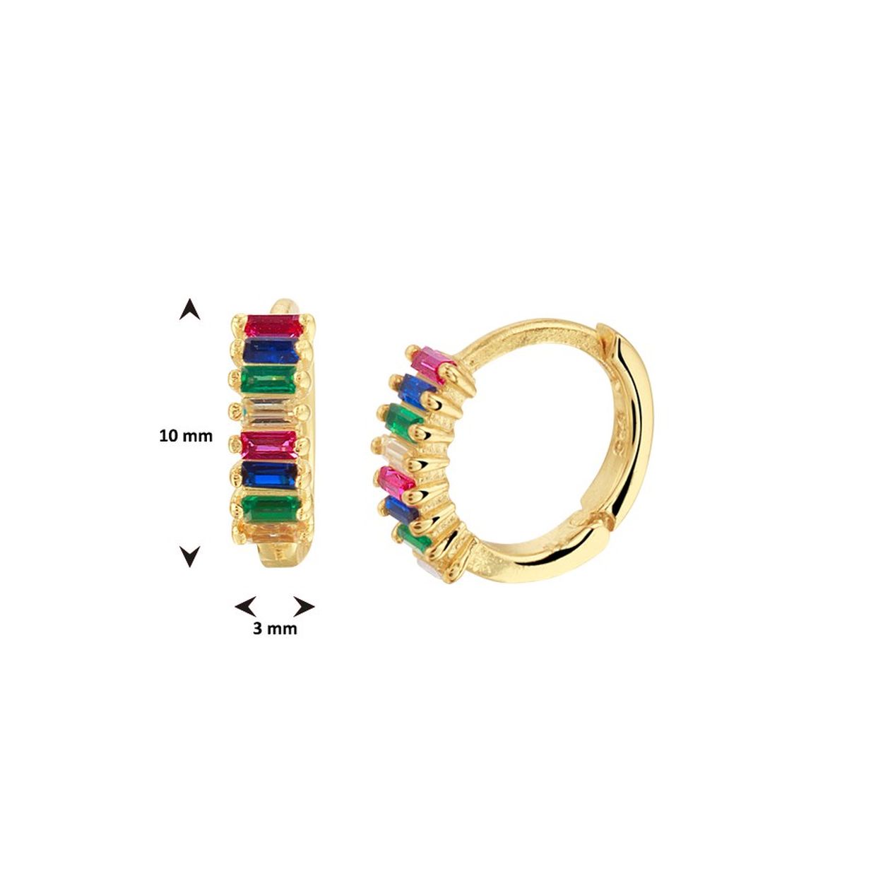 Geelgoud op 925 zilveren oorringen met scharnier, uitgevoerd met een gekleurde zirkonia rij. De oorringen hebben een diameter van 10mm.