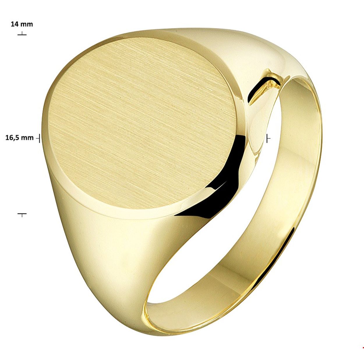 Stijlvolle geelgouden massieve graveerring met een afmeting van 16.5x14mm. De gediamanteerde afwerking en de robuuste afkanting maken de ring helemaal af.